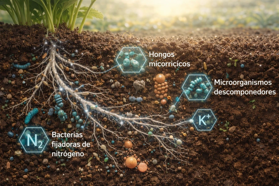 Cada gramo de tierra fértil puede contener más organismos vivos que personas en el planeta. Estos microorganismos —bacterias, actinomicetos, hongos, protozoos y algas— forman una red biológica compleja que transforma la materia orgánica en nutrientes disponibles para las plantas.